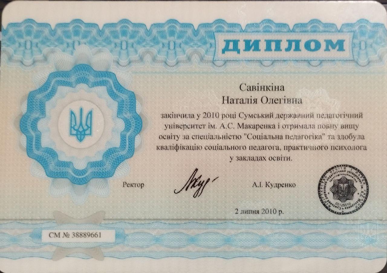 Sumy State Pedagogical University named after A.S. Makarenko, Social Pedagogue and Practical Psychologist, Faculty of Practical Psychology, Specialist, 2010.