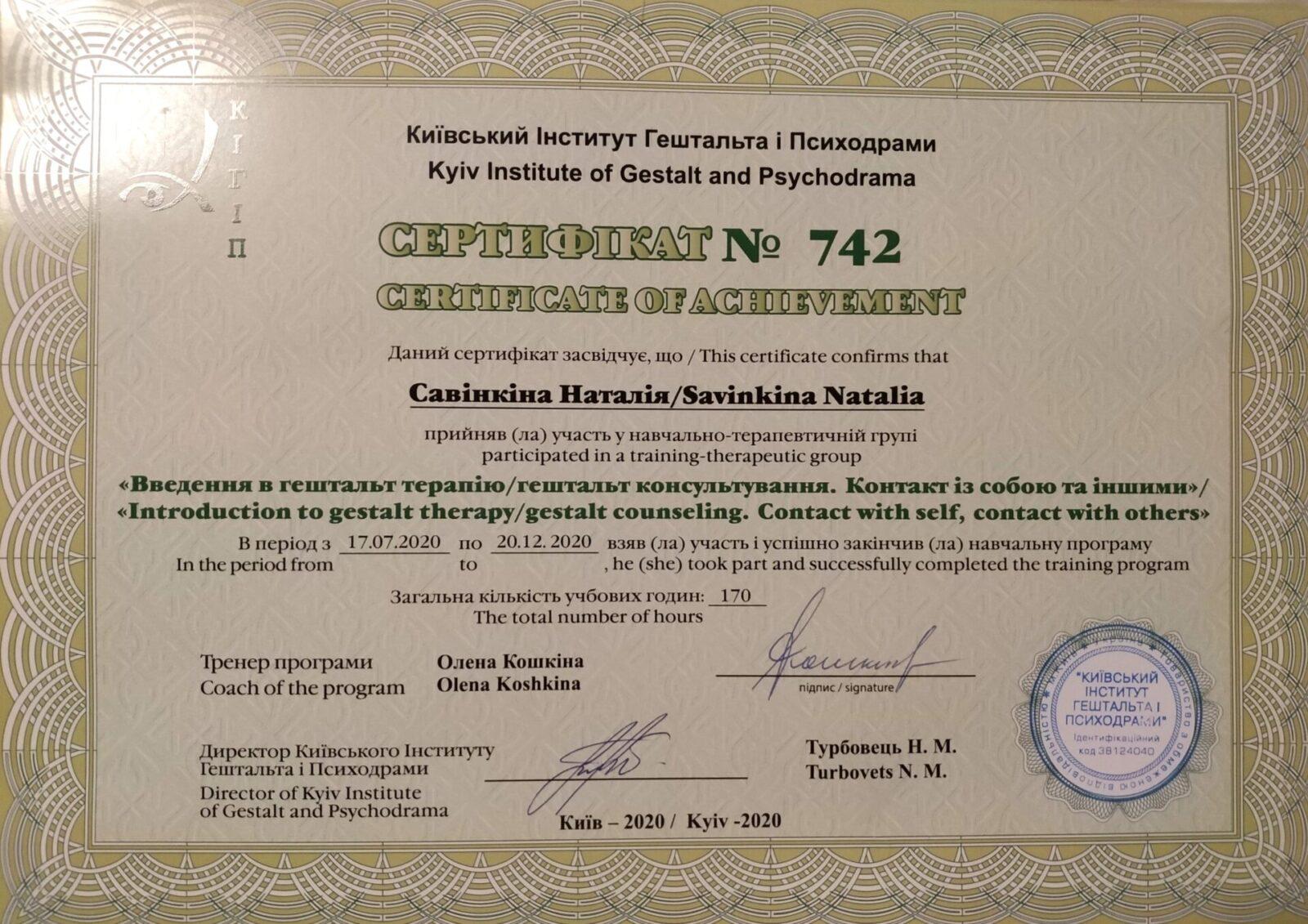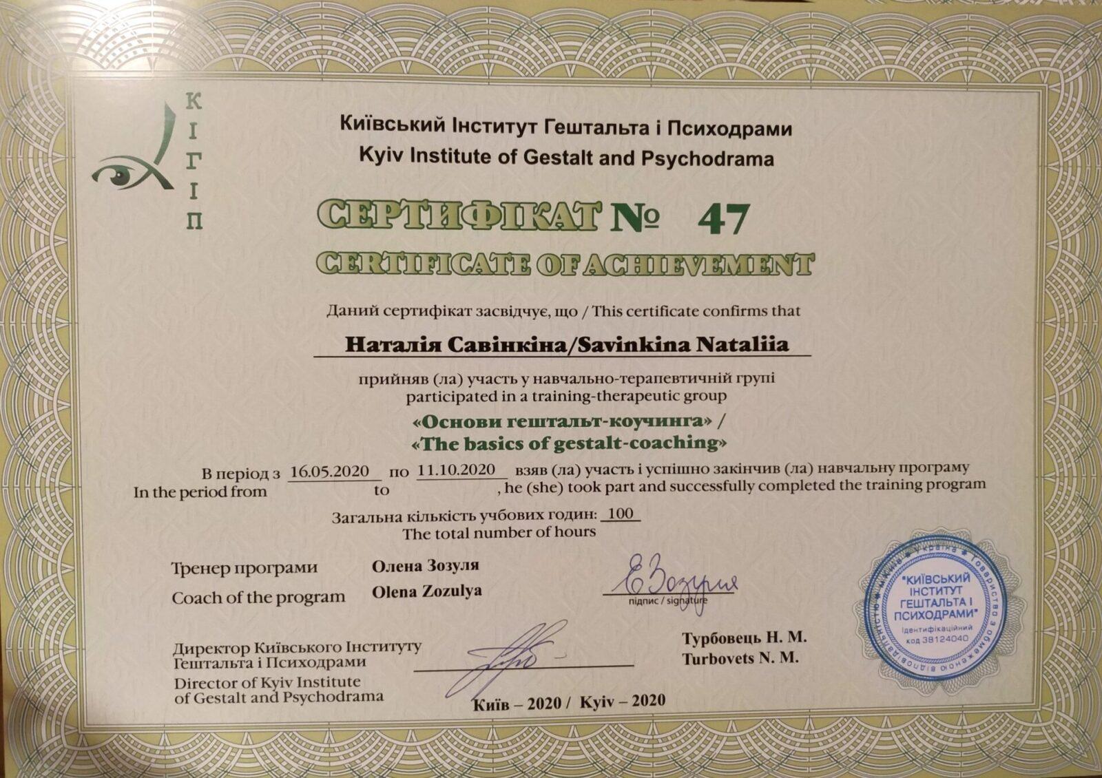 Specialization: Gestalt Coaching, 2020, course by Olena Zozula. Practitioner of Gestalt Coaching.