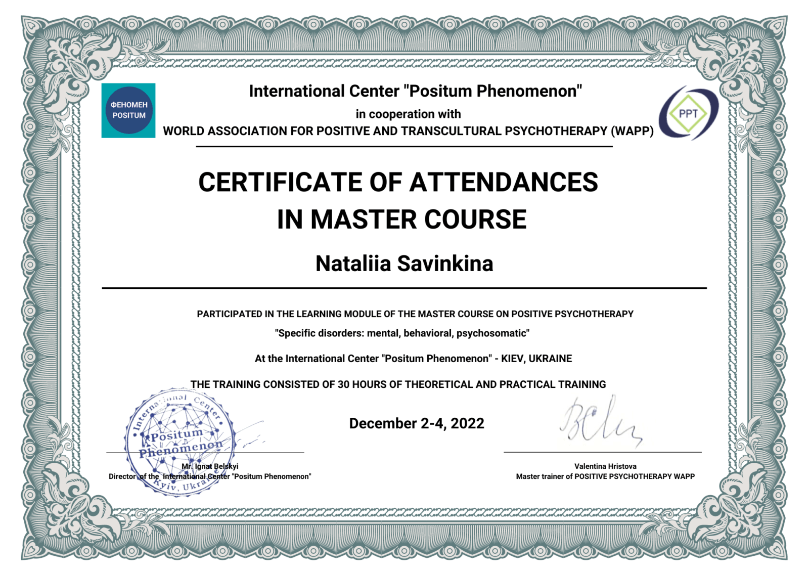 2022- present time studying on a 4-year program. Specialty "Psychotherapist in the method of positive psychotherapy".