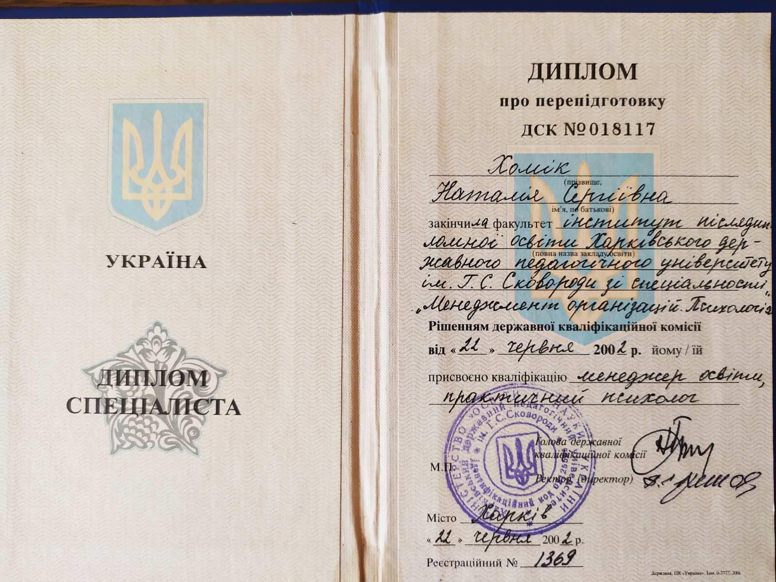 From 1999 to 2002, Kharkiv State Pedagogical University, specialty "Manager in educational institutions, practical psychologist."