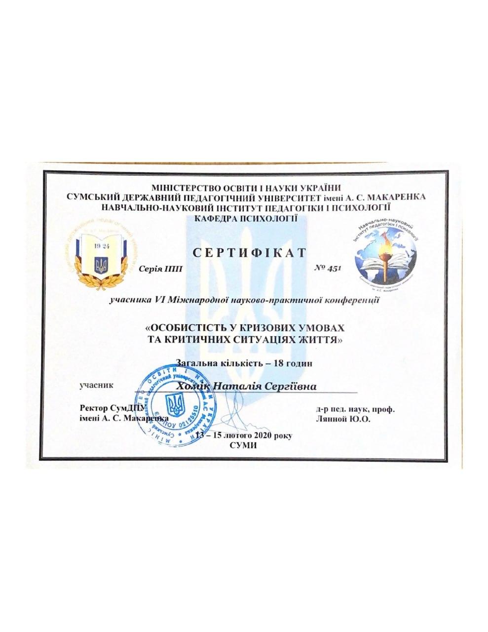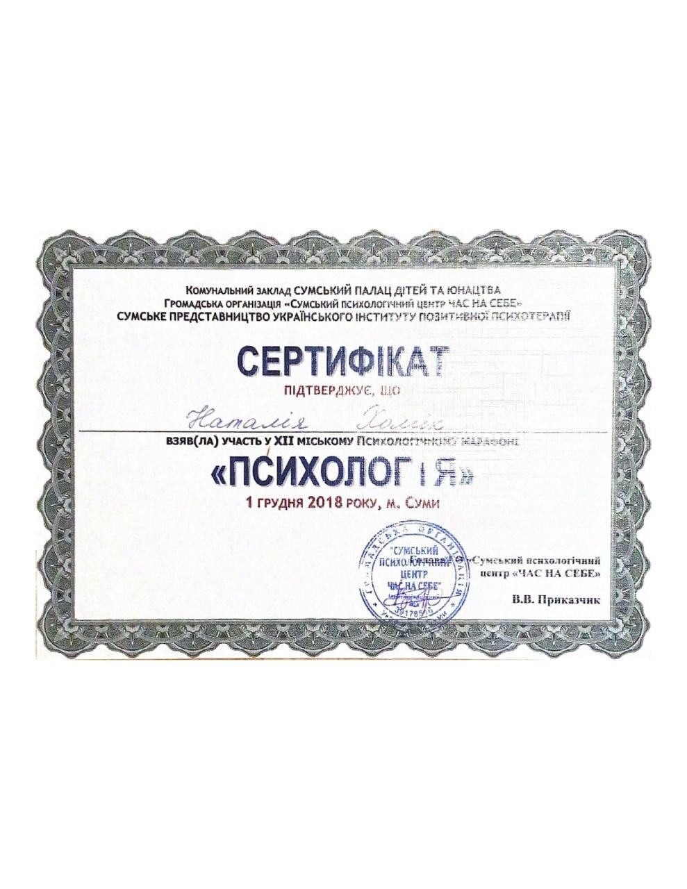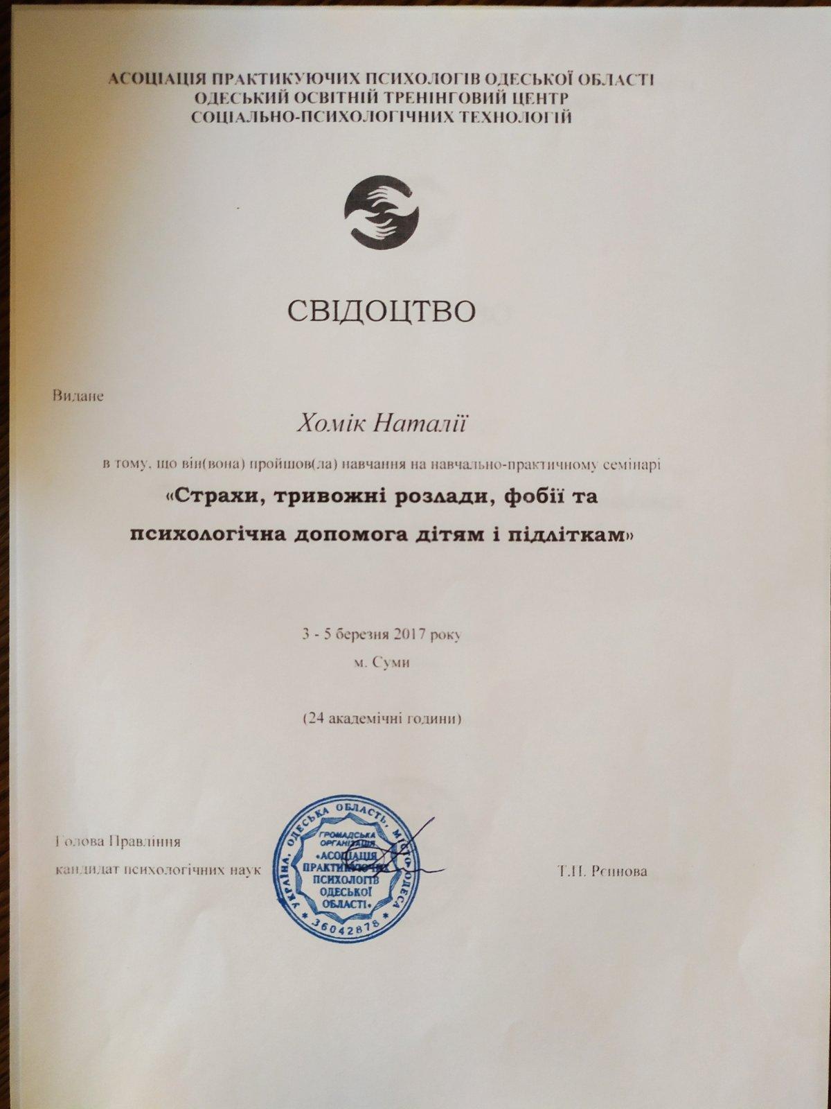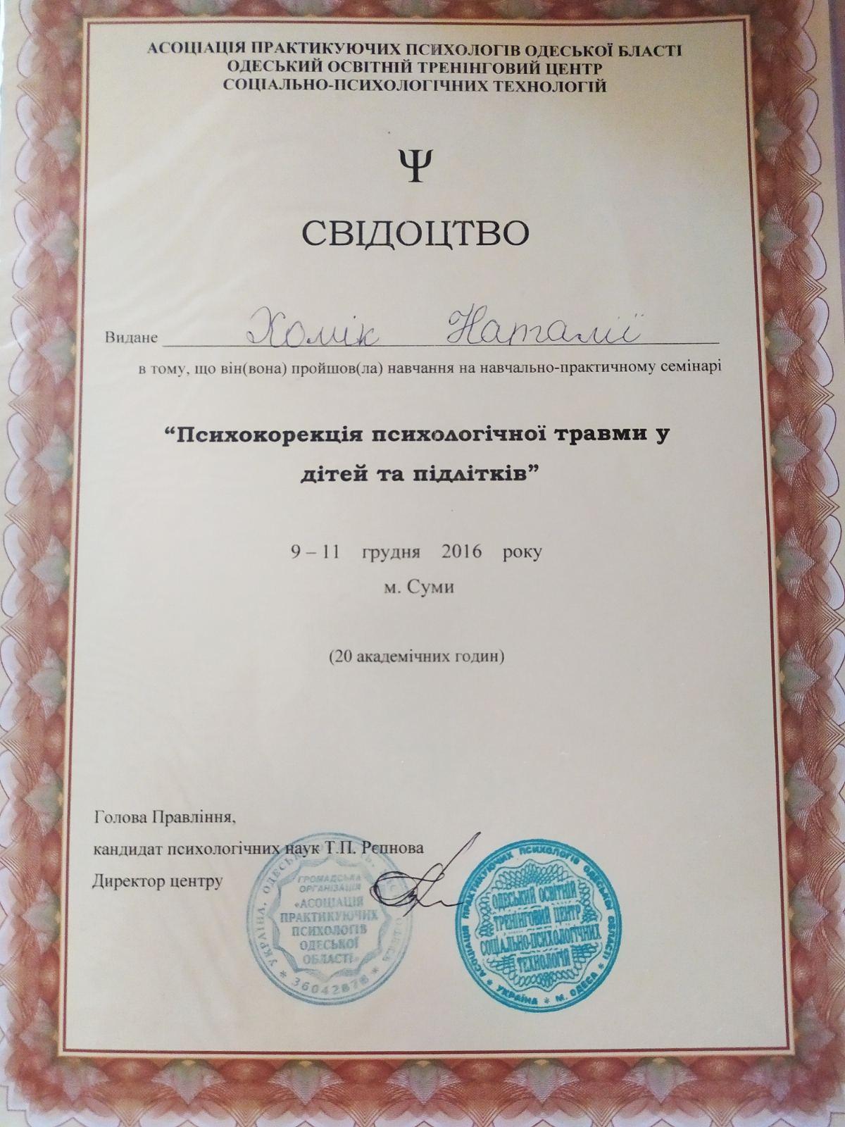 Course "Fundamentals of Trauma Therapy" (psychological first aid, psychological assistance in grief, loss, emergency stabilization protocols (ISP), International Institute of Postgraduate Education, 2023.