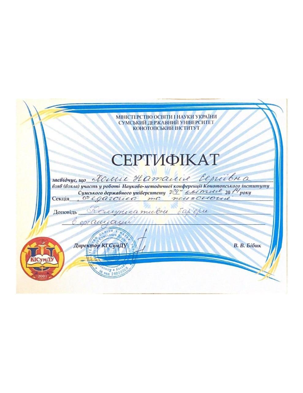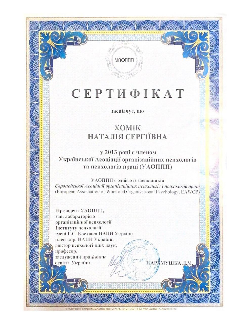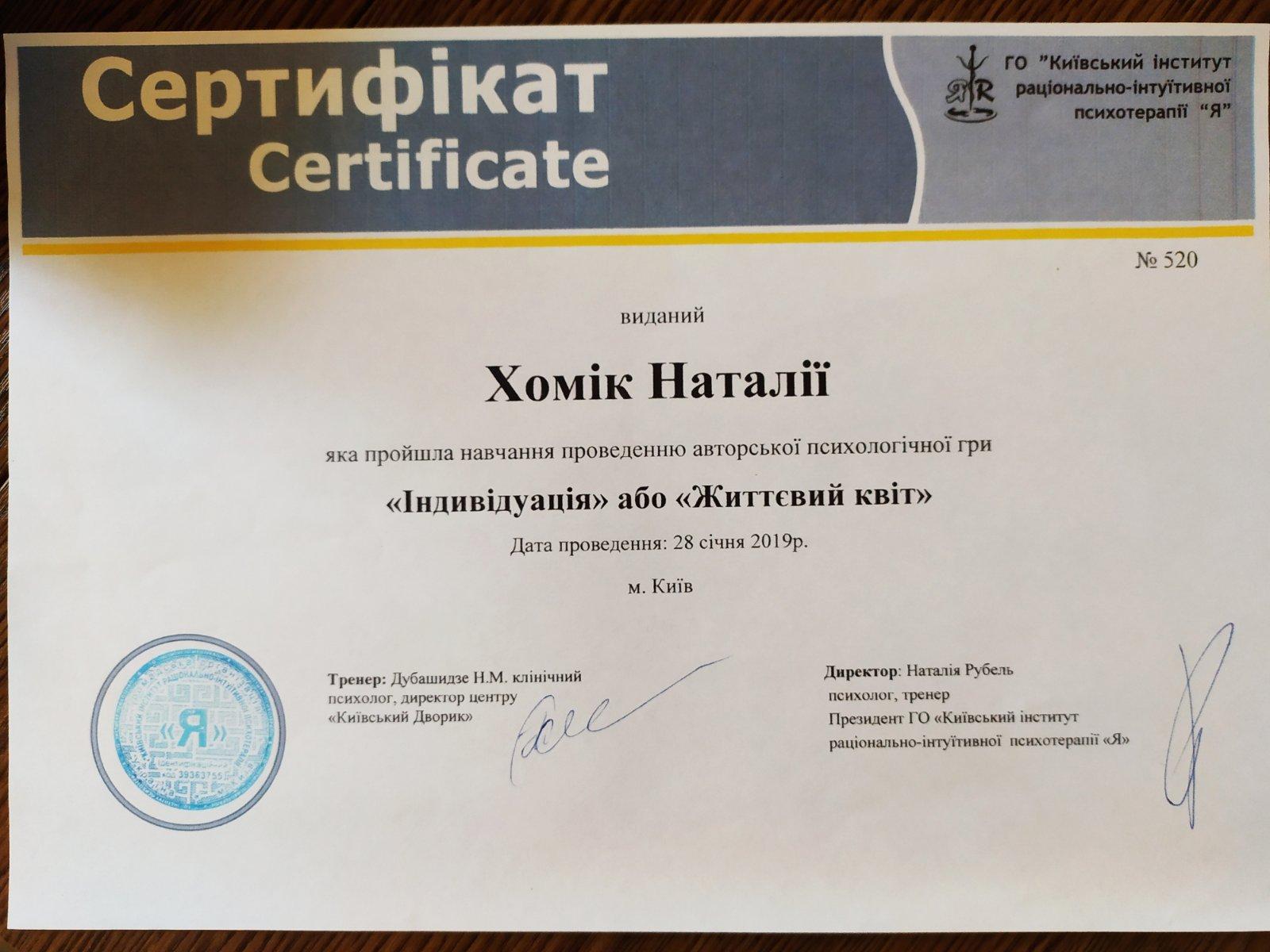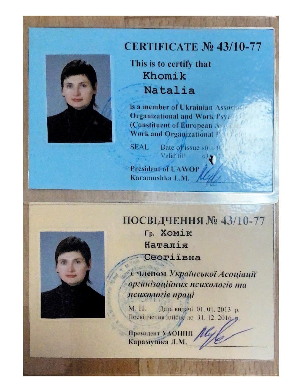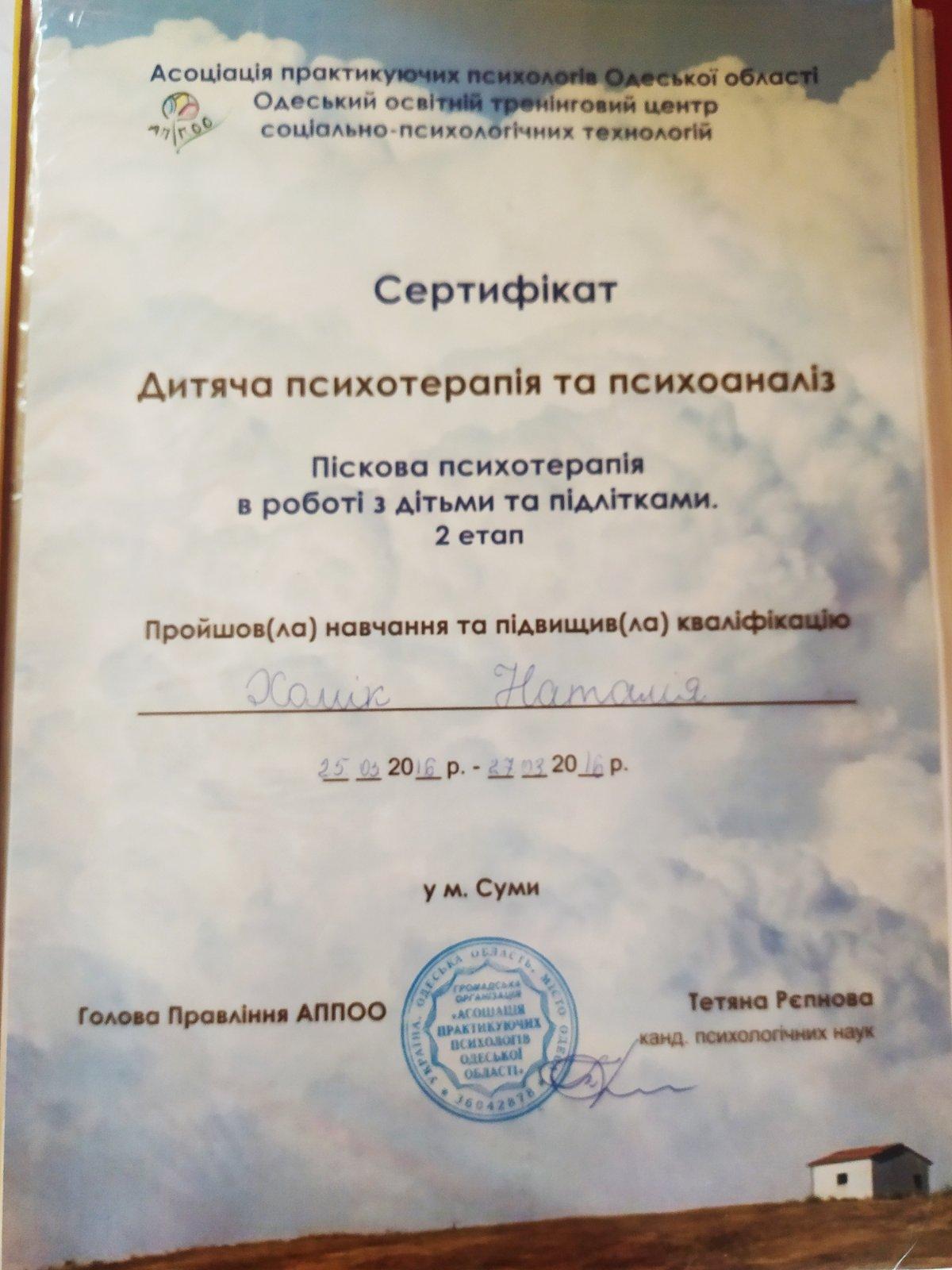 Course "Fundamentals of Trauma Therapy" (psychological first aid, psychological assistance in grief, loss, emergency stabilization protocols (ISP), International Institute of Postgraduate Education, 2023.