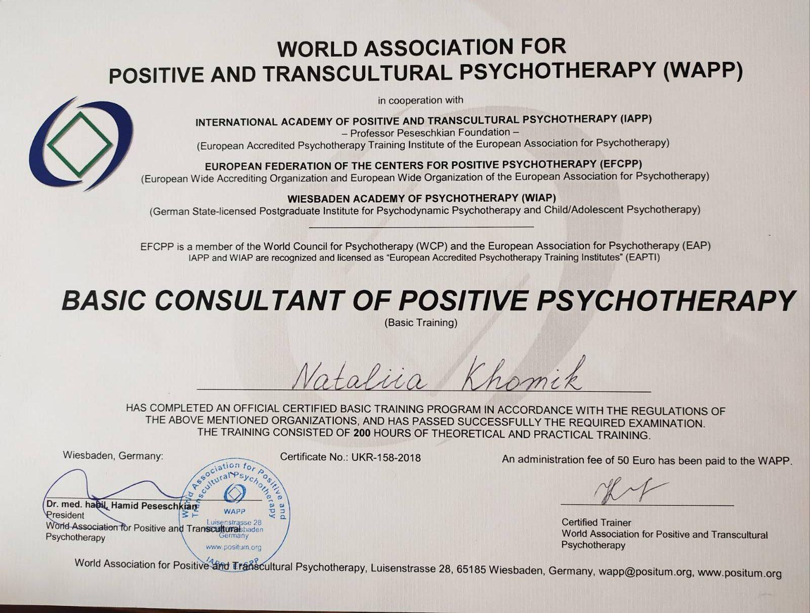 1. Psychologist-consultant in the Positive Transcultural Psychotherapy method (WAPP Wiesbaden).