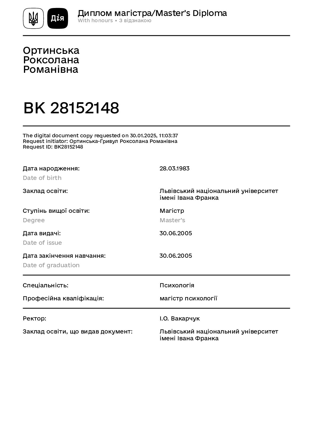 Ivan Franko National University of Lviv, Master of Psychology (2005)