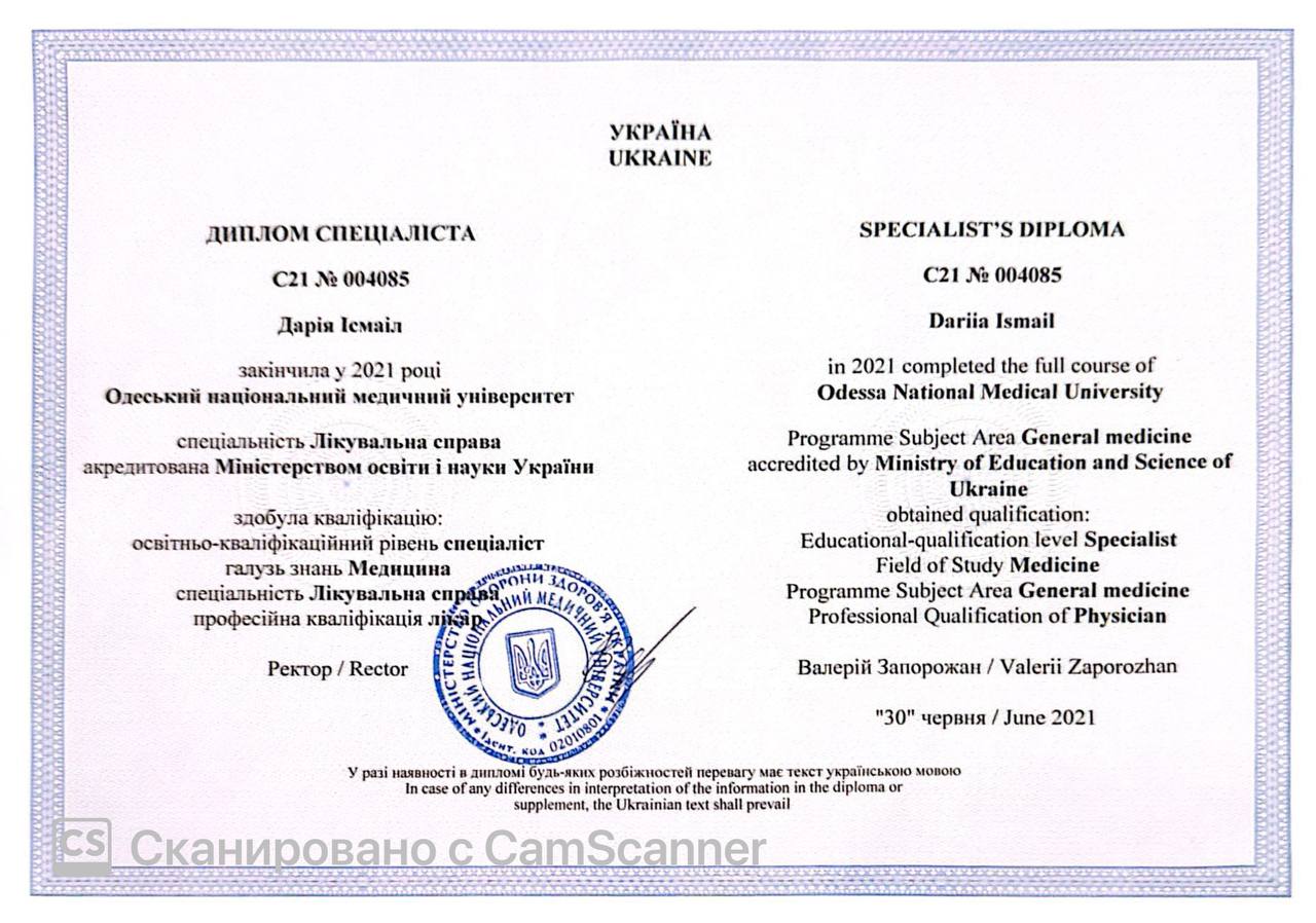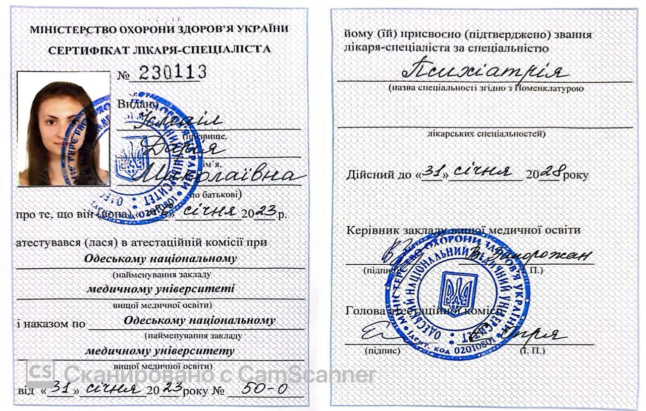 2021 г. Одесский национальный медицинский университет, специальность: лечебное дело. 2023 г. Интернатура: психатрия, наркология, клиническая психология.