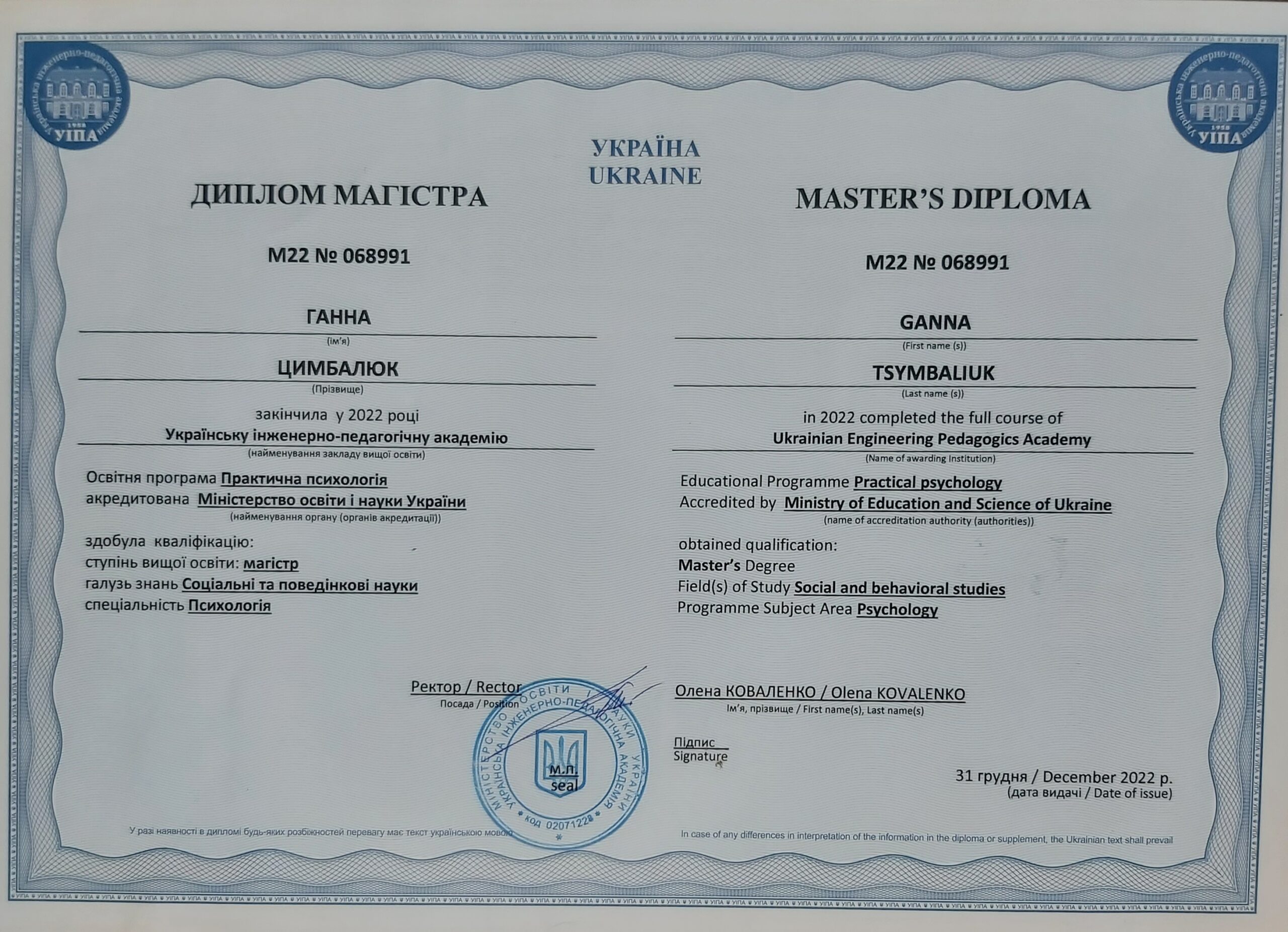 Практическая психология (Украинская инженерно-педагогическая академия, 2022 выпуск, магистр).