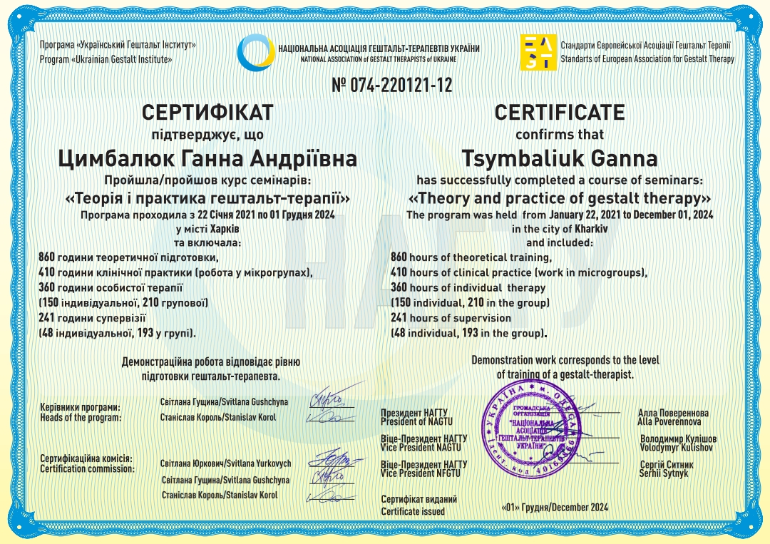 Гештальт-терапия (НАГТУ, 2020-2024 годов обучения, сертифицирована).