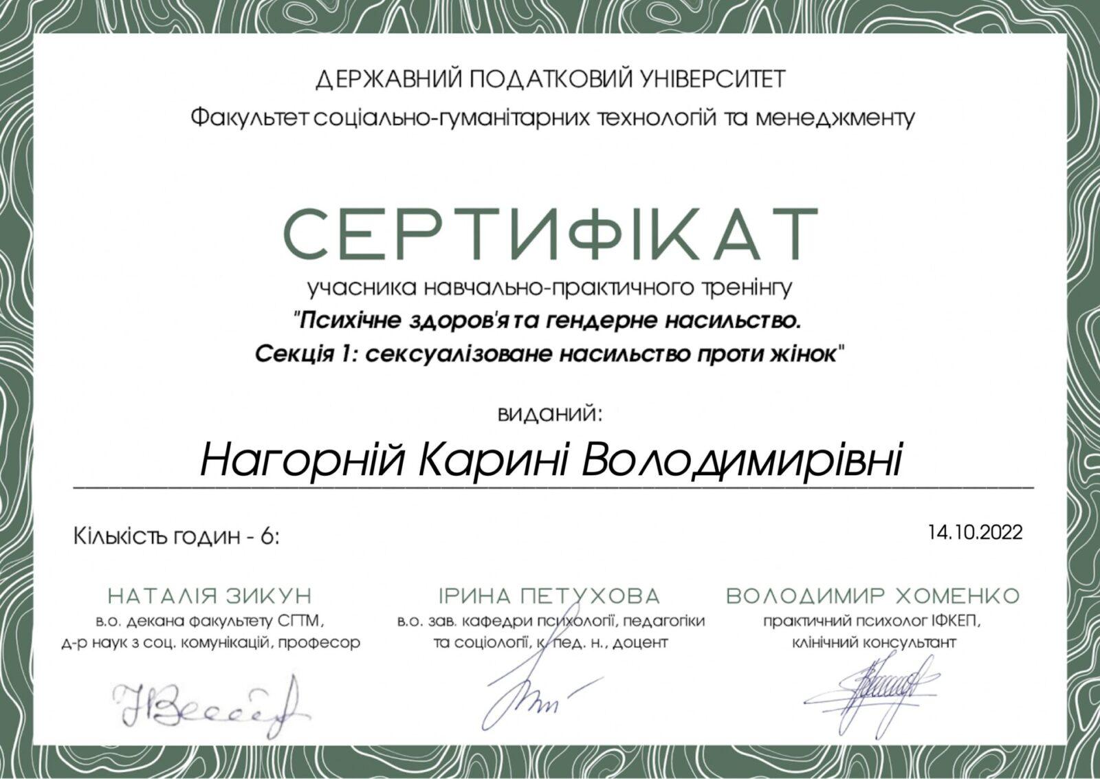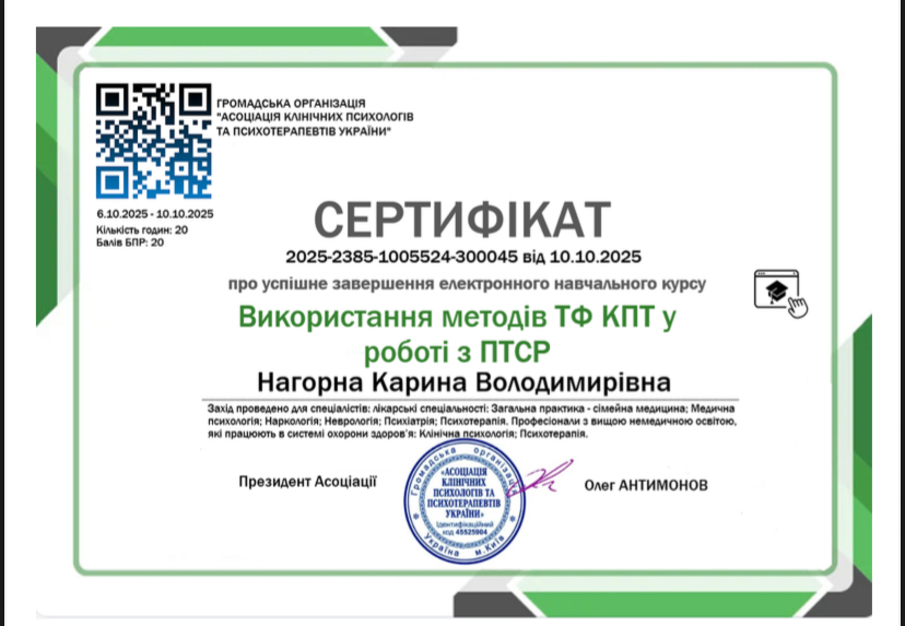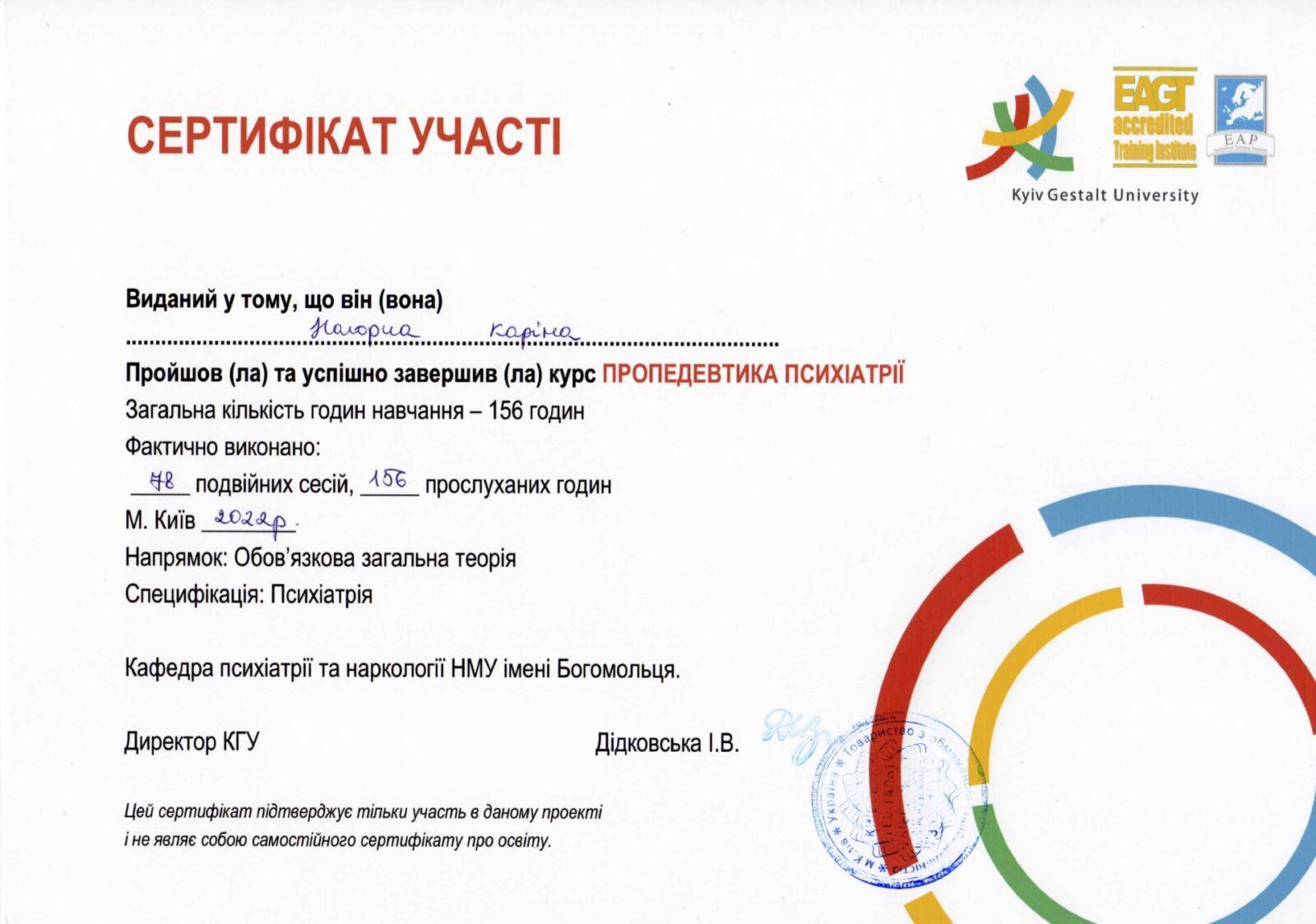 Пропедевтика психиатрии, 156 часов. Кафедра психиатрии и наркологии НМУ имени Богомольца; Киевский гештальт университет.