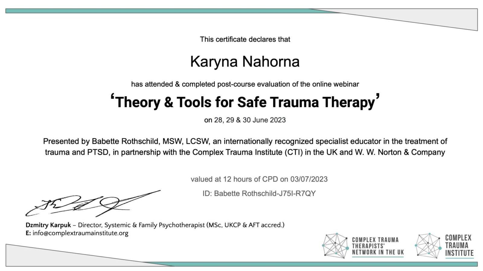 Комплексная trauma institute "Теория и инструменты для безопасной траумы терапии" в Babette Rothschild, 12 часов.