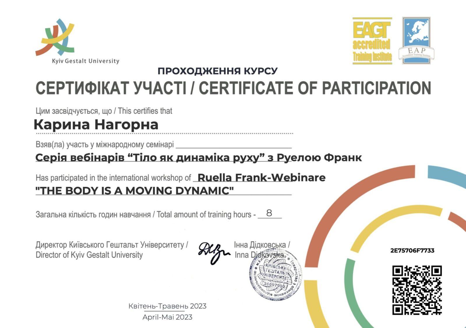 Курс "Тело как динамика движения" с Руэлой Франк, 8 часов. Киевский гештальт университет.