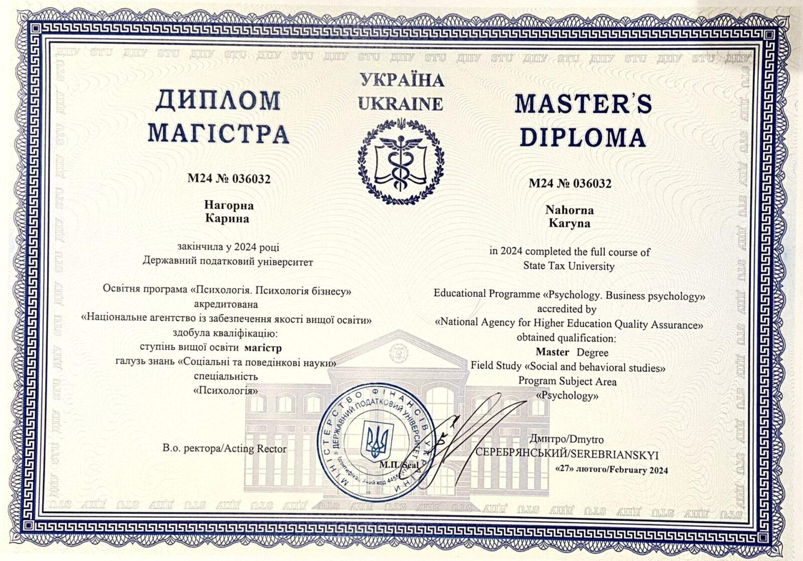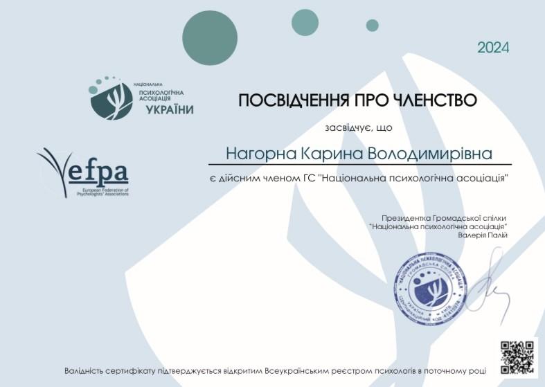 Практический психолог, арт-терапевт, гештальт-терапевт в обучении. Специализируется на работе с тревожными и депрессивными состояниями, экзистенциальными кризисами, проблемами в отношениях. Член национальной психологической ассоциации Украины.