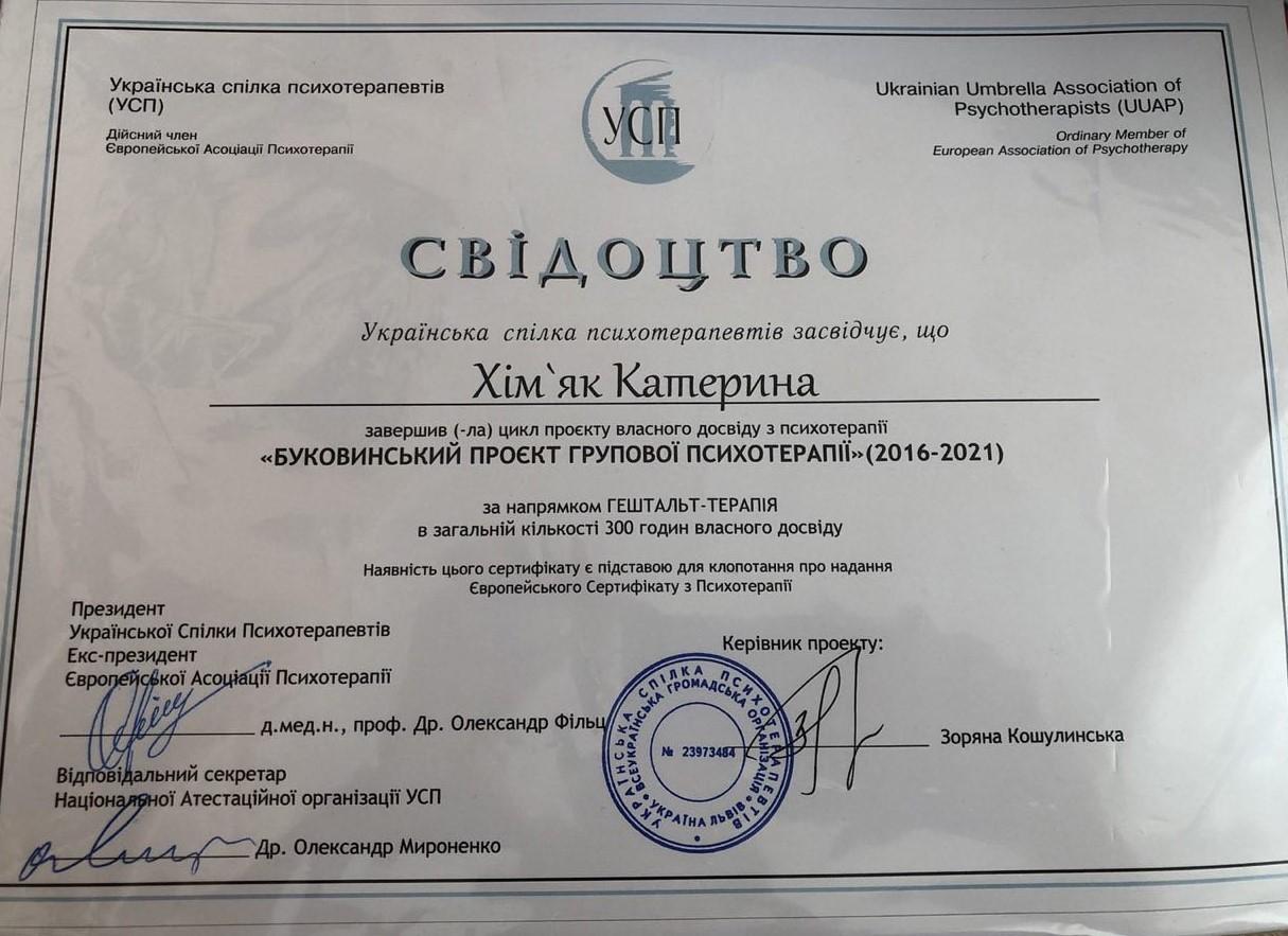 Буковинский проект по групповой психотерапии, Украинский Союз Психотерапевтов, под супервидением Европейской Ассоциации Психотерапии, гештальт-терапия, (2015-2021)