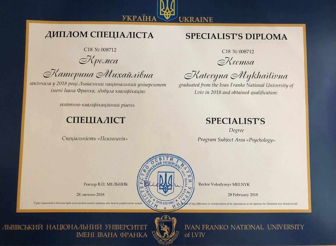 Львовский национальный университет им. И. Франко, философский факультет, специальность – психология, (2014-2018).