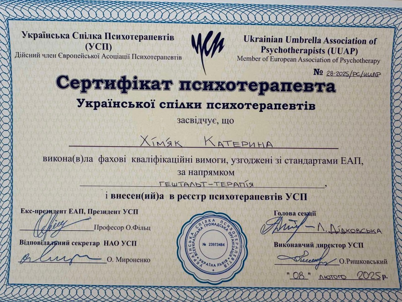 Украинский Психотерапевтический Университет, направление "гештальт-терапия", завершаю обучение, 2018-2023 гг.