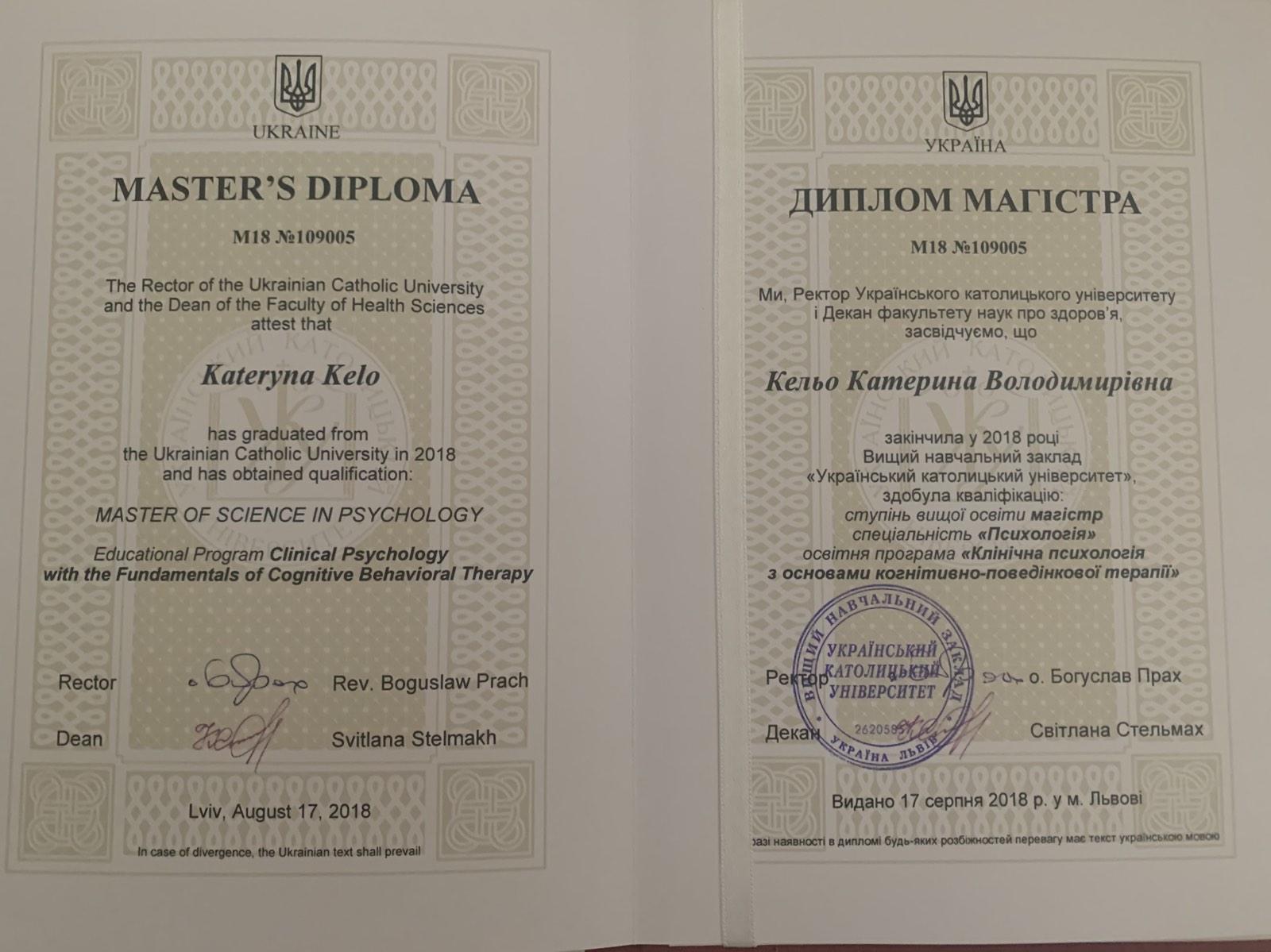 Магистр клинической психологии с основами КПТ (Католический университет 2016-2018 гг.)