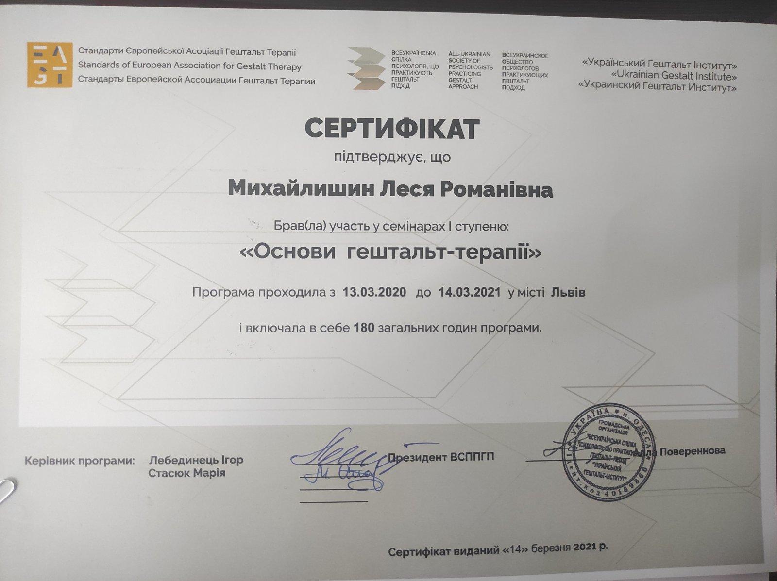 2020-2021 Украинский Гештальт институт, «Основы гештальт-терапии», консультант сертифицирован по стандартам Европейской Ассоциации Гештальт Терапии