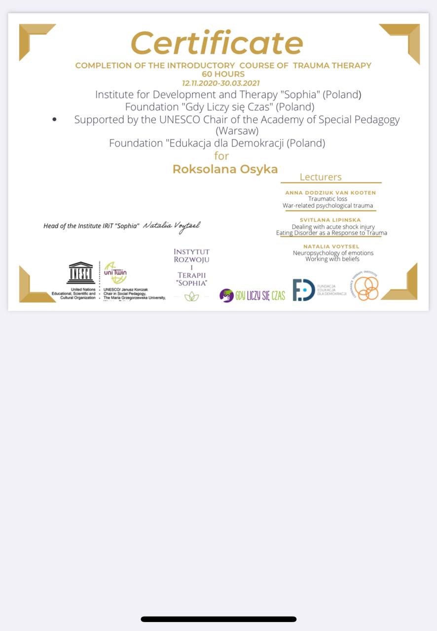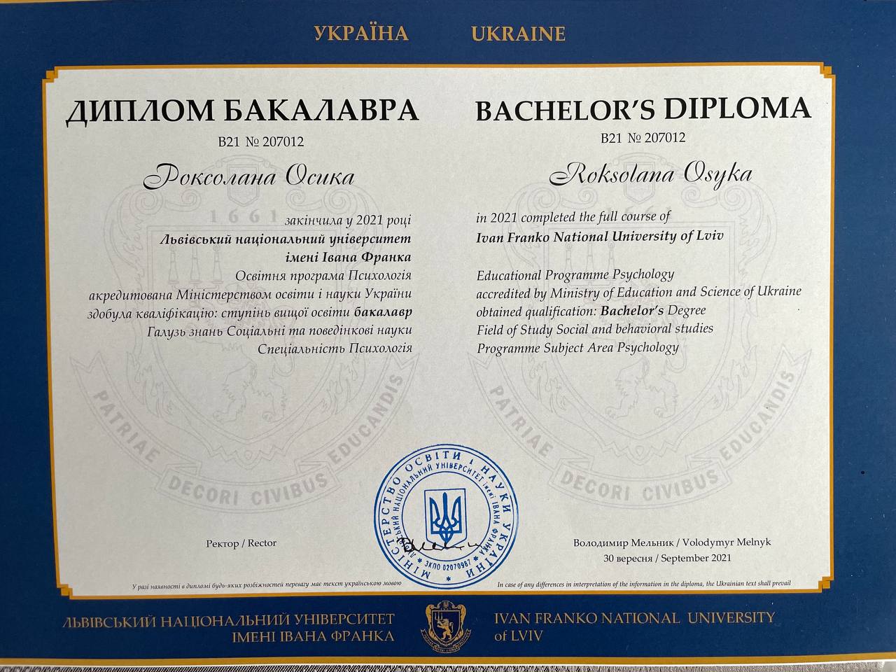 УКУ-магистр, клинический психолог по программе «Клиническая психология с основами психолинамической терапии».
