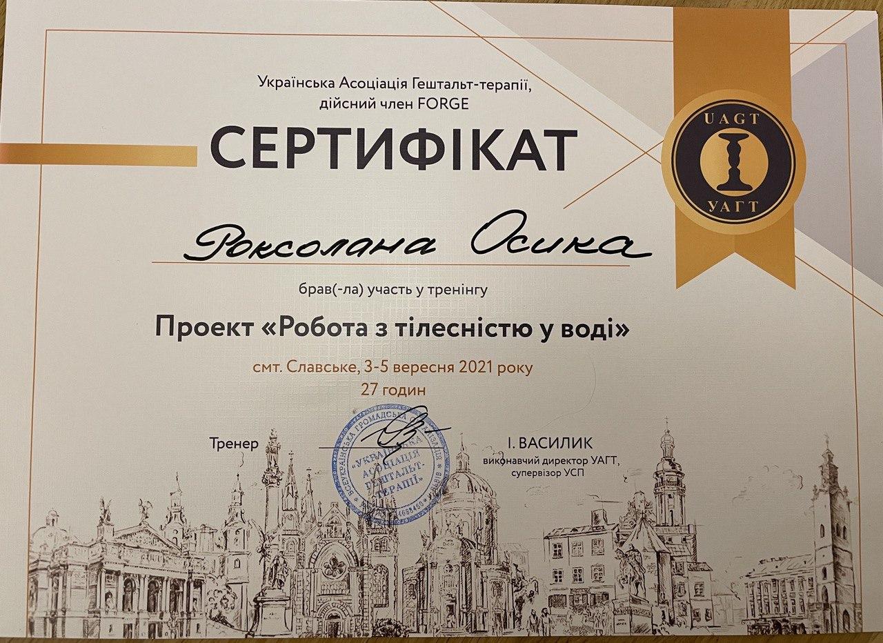 Пройдены дополнительные семинары: «работа с телесностью в воде» (2021 и 2023), «тело как динамика движения от Руэллы Франкл», «Что такое исцеление. Телесно ориентированная гештальт терапия от Ария Бурштейна»