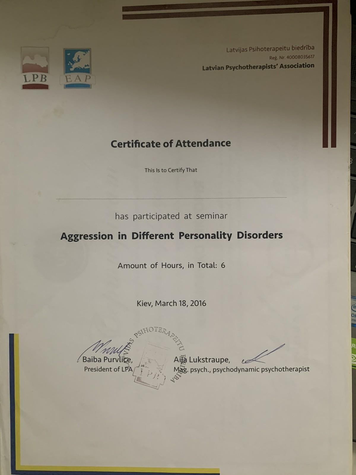 Тренинг по управлению агрессивными реакциями при различных расстройствах личности, Латвийская ассоциация психотерапевтов, март 2016