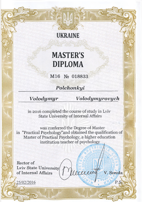 Львовский государственный университет внутренних дел, магистр психологии (2016).