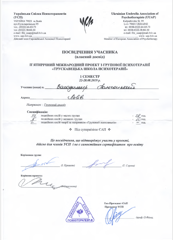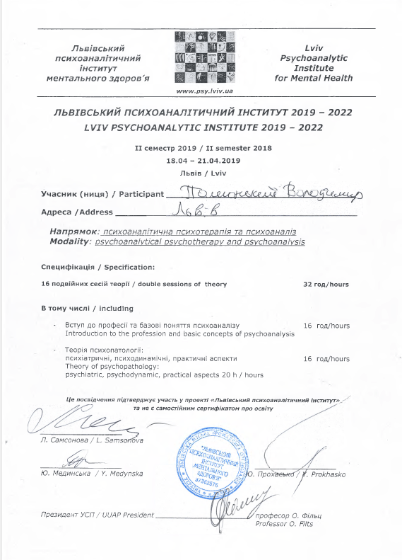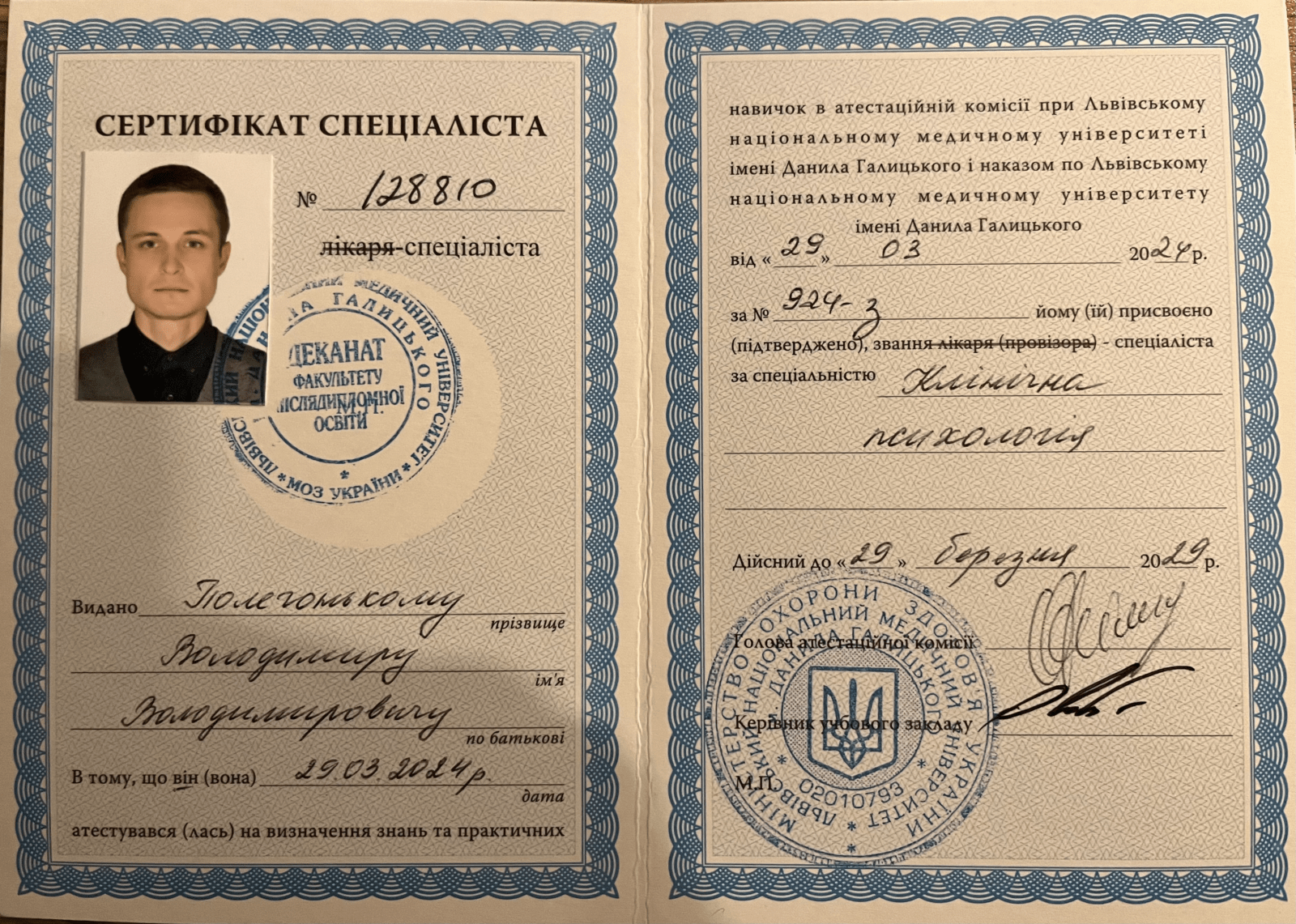 Львовский национальный медицинский университет, факультет последипломного образования, специализация «Клиническая психология» (2024)