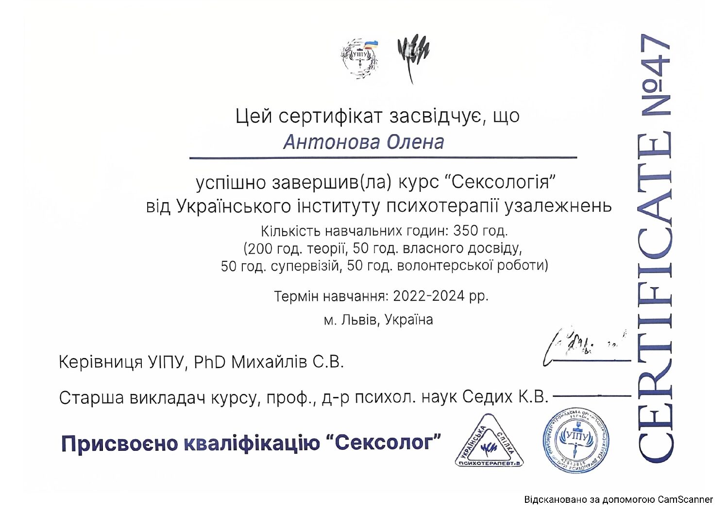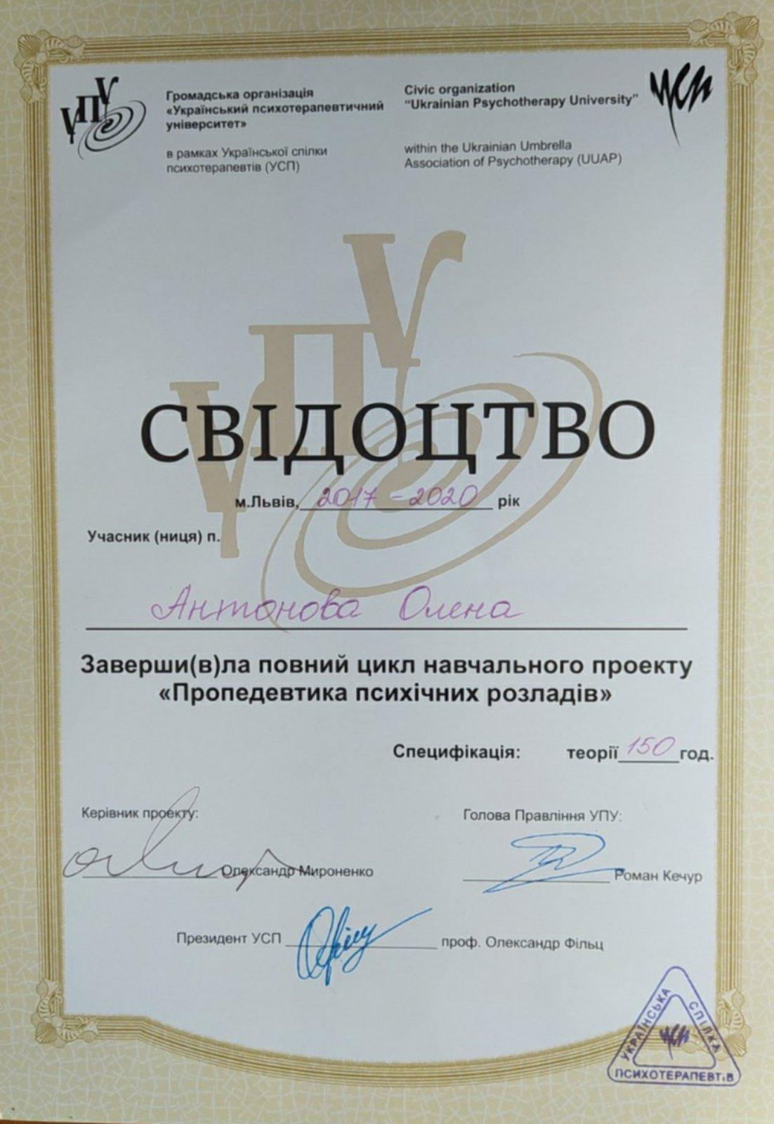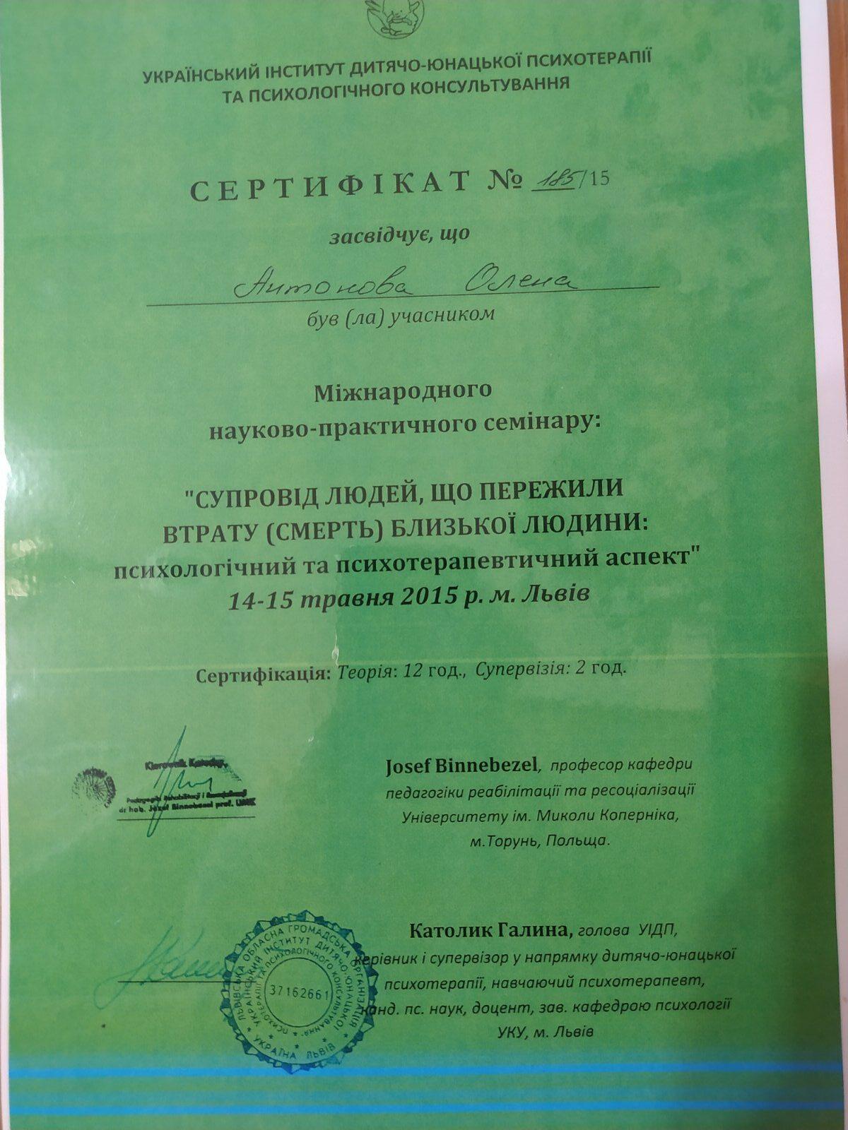 Інститут післядипломної освіти за навчальною програмою для практичних психологів та соціальних педагогів, курс «Індивідуальне та сімейне психологічне консультування»- СП № 1541024, протокол №06 від 20.06.2012