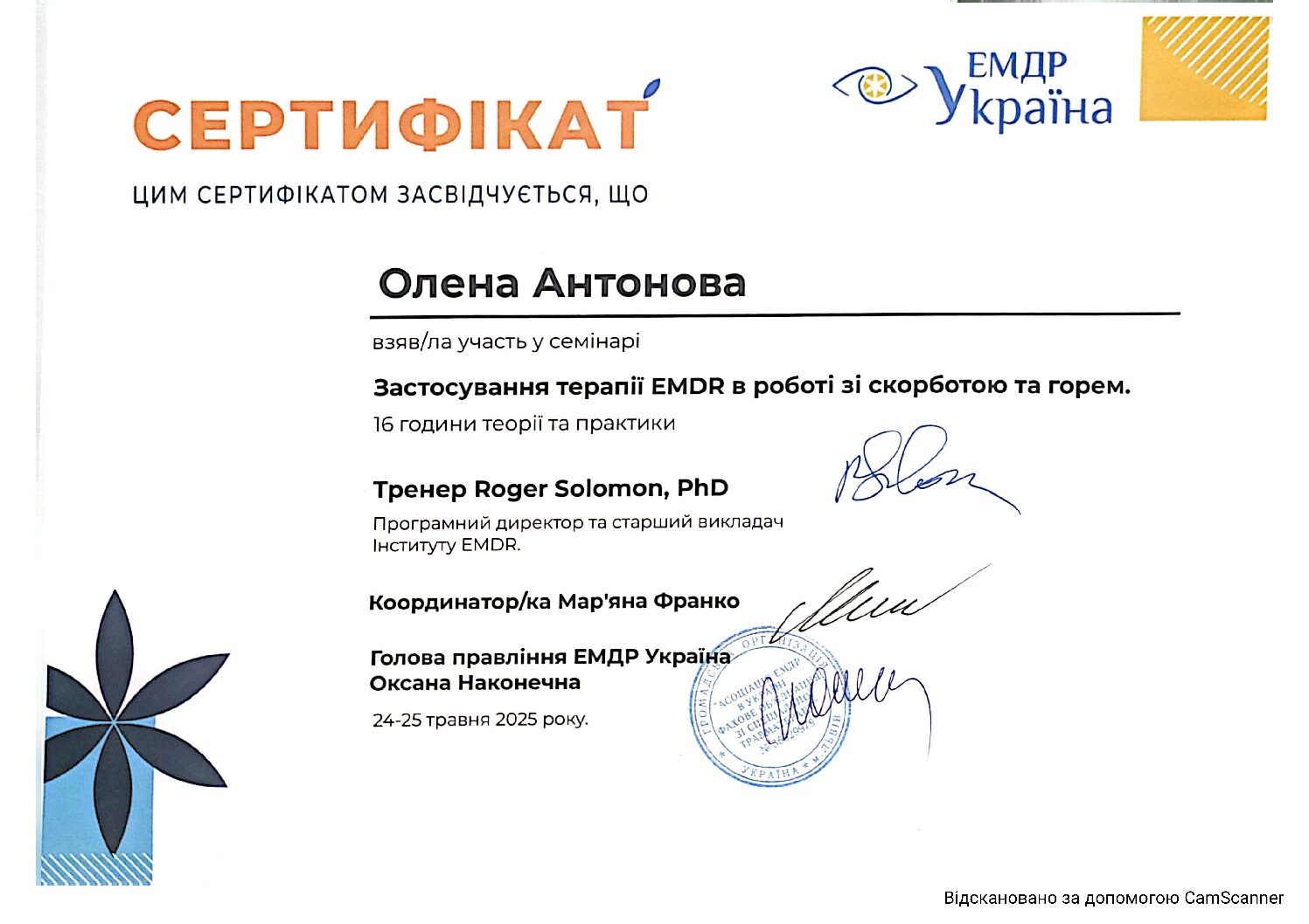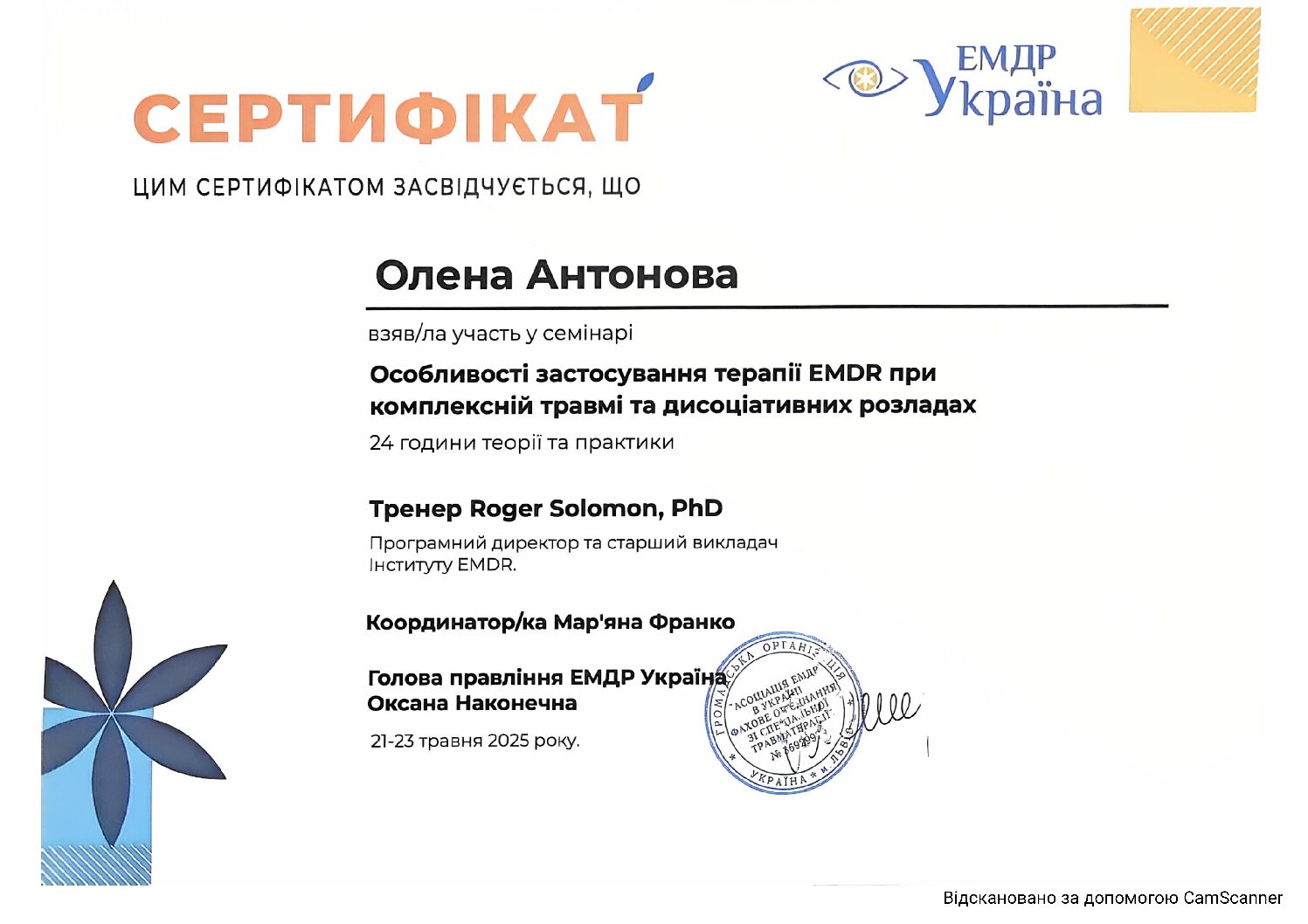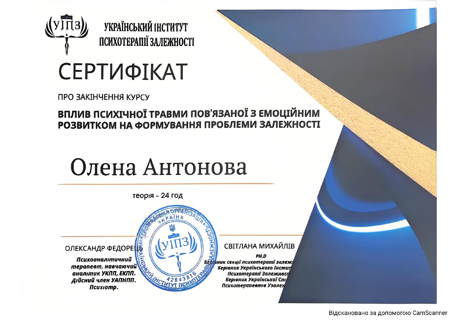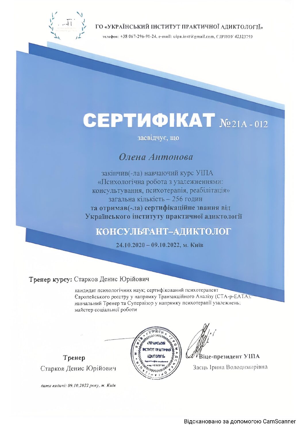 Інститут післядипломної освіти за навчальною програмою для практичних психологів та соціальних педагогів, курс «Індивідуальне та сімейне психологічне консультування»- СП № 1541024, протокол №06 від 20.06.2012