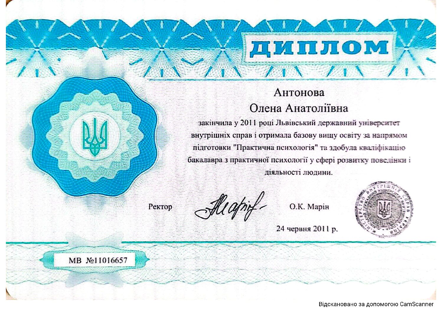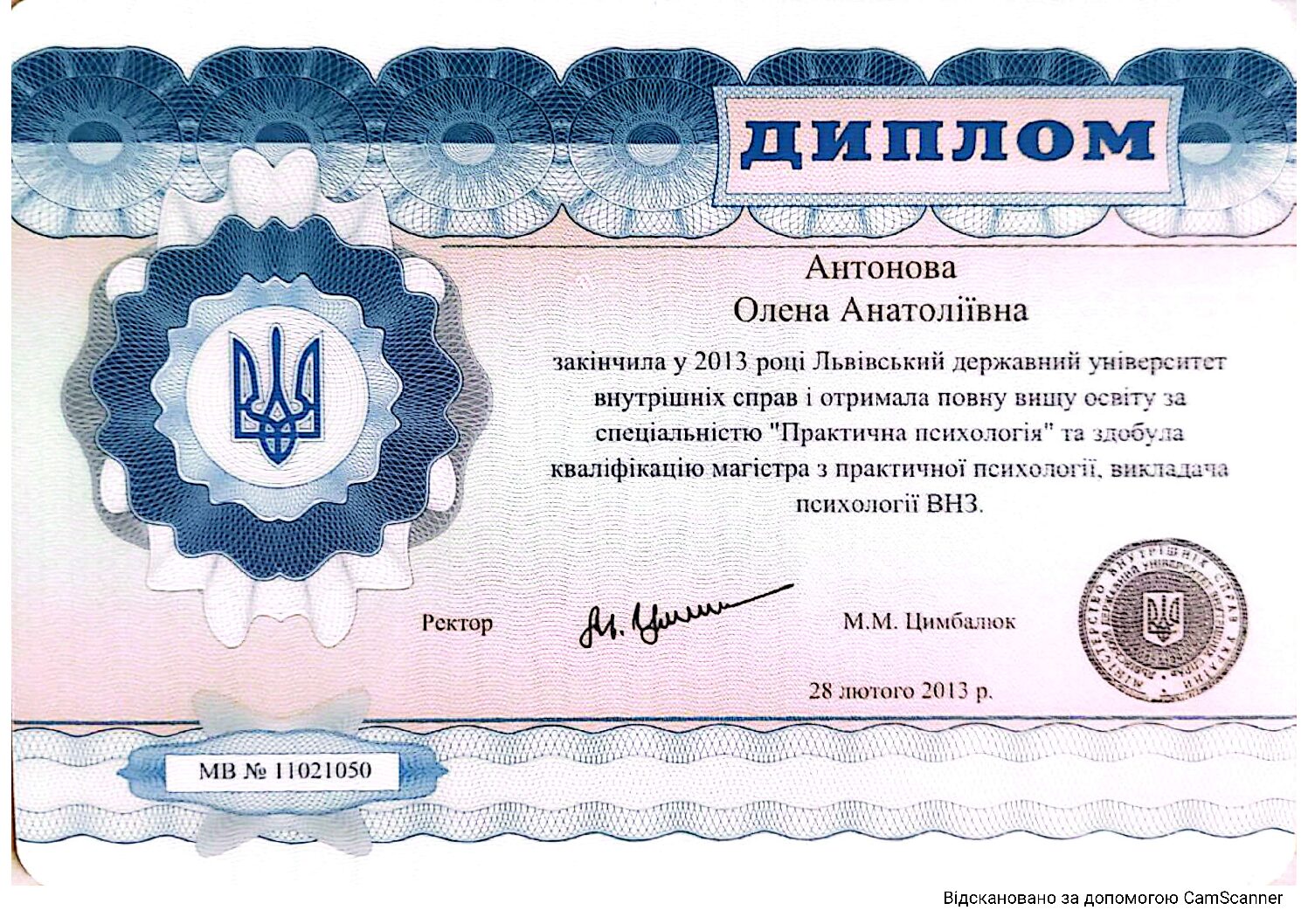 ЛьвДУВС. Спеціальність: практична психологія; кваліфікація: магістр з практичної психології, викладач психології ВНЗ, диплом № МВ 11021050 від 28.02.2013