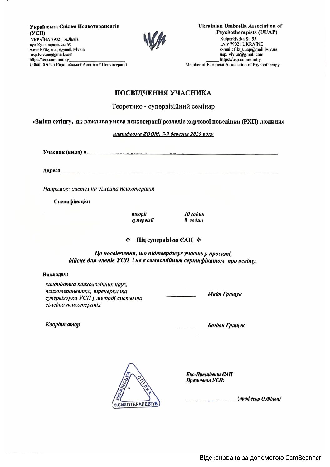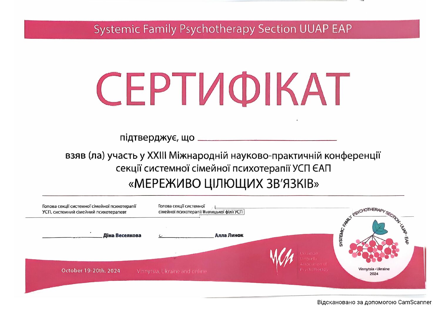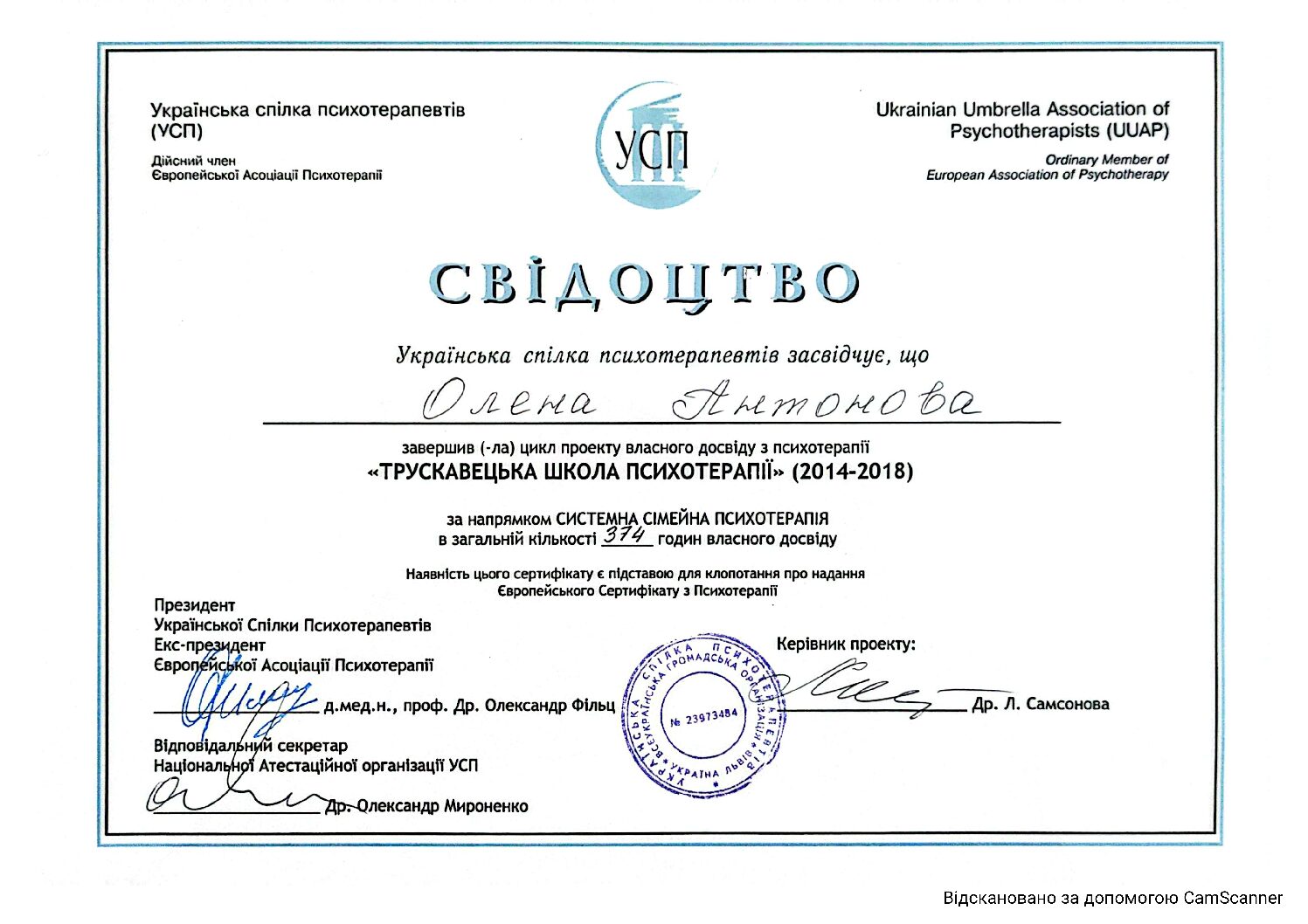 «Трускавецька Школа Психотерапії» за напрямком «Системна сімейна психотерапія» 2014-2018 р.